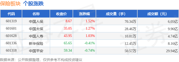 证券之星消息,11月27日保险板块较上一交易日上涨0.53%,中国人保领涨。当日上证指数报收于3875.26,上涨0.29%。深证成指报收于12875.19,下跌0.25%。保险板块个股涨跌见下表: