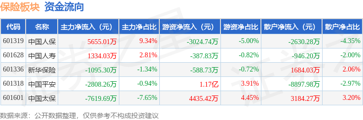 从资金流向上来看,当日保险板块主力资金净流出4534.21万元,游资资金净流入1.21亿元,散户资金净流出7606.16万元。保险板块个股资金流向见下表: