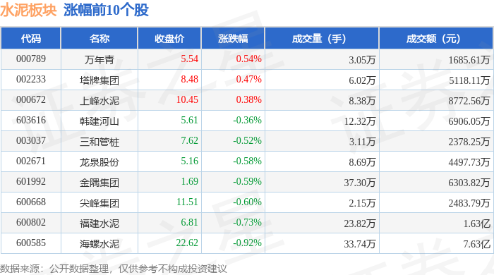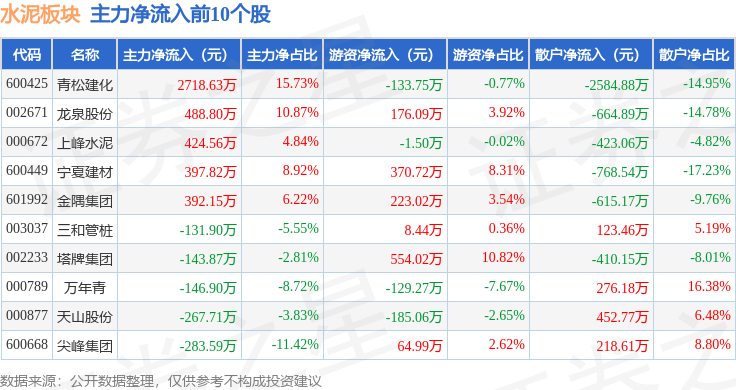 从资金流向上来看,当日水泥板块主力资金净流出3.67亿元,游资资金净流入8788.14万元,散户资金净流入2.79亿元。水泥板块个股资金流向见下表: