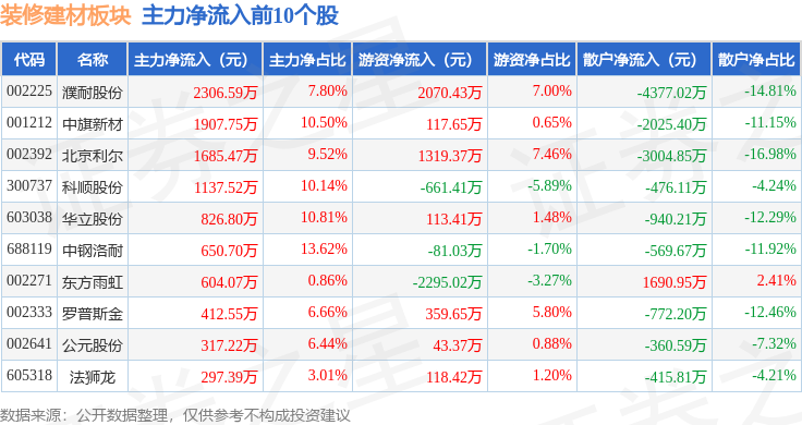 从资金流向上来看,当日装修建材板块主力资金净流出3.72亿元,游资资金净流入2.01亿元,散户资金净流入1.71亿元。装修建材板块个股资金流向见下表:
