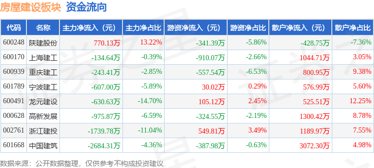 从资金流向上来看,当日房屋建设板块主力资金净流出6245.52万元,游资资金净流出1836.59万元,散户资金净流入8082.1万元。房屋建设板块个股资金流向见下表: