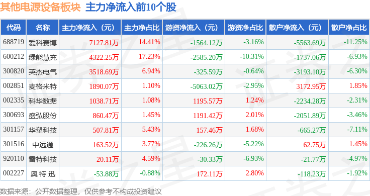 从资金流向上来看,当日其他电源设备板块主力资金净流出6.21亿元,游资资金净流入1740.01万元,散户资金净流入6.04亿元。其他电源设备板块个股资金流向见下表:
