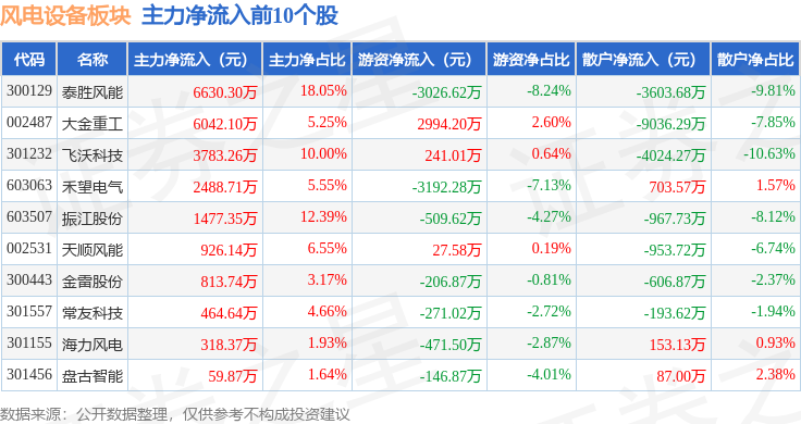从资金流向上来看,当日风电设备板块主力资金净流出5296.94万元,游资资金净流出5662.7万元,散户资金净流入1.1亿元。风电设备板块个股资金流向见下表: