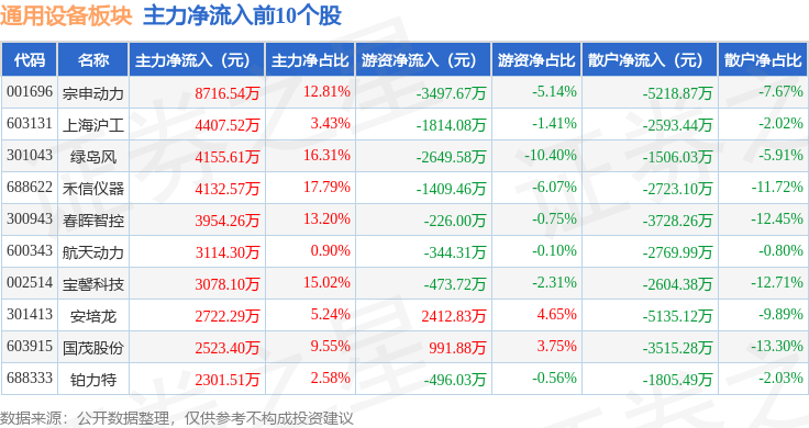 从资金流向上来看,当日通用设备板块主力资金净流出12.13亿元,游资资金净流入4814.35万元,散户资金净流入11.65亿元。通用设备板块个股资金流向见下表: