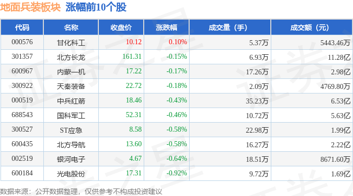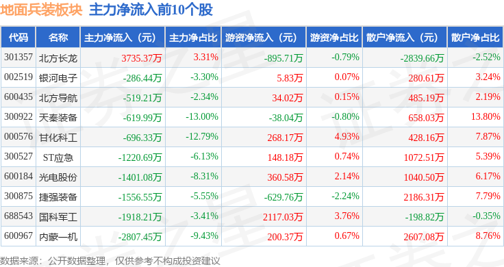从资金流向上来看,当日地面兵装板块主力资金净流出2.67亿元,游资资金净流出3083.24万元,散户资金净流入2.98亿元。地面兵装板块个股资金流向见下表: