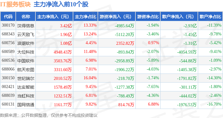 从资金流向上来看,当日IT服务板块主力资金净流出19.05亿元,游资资金净流入8100.68万元,散户资金净流入18.24亿元。IT服务板块个股资金流向见下表: