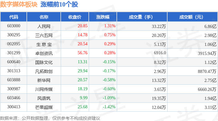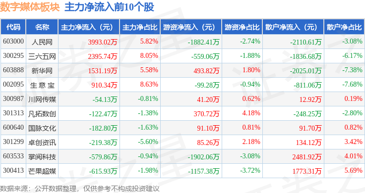 从资金流向上来看,当日数字媒体板块主力资金净流出2.8亿元,游资资金净流出228.03万元,散户资金净流入2.82亿元。数字媒体板块个股资金流向见下表: