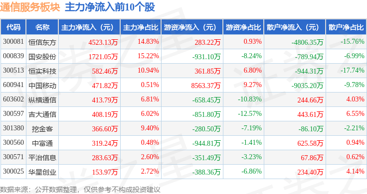 从资金流向上来看,当日通信服务板块主力资金净流出9.27亿元,游资资金净流入2.99亿元,散户资金净流入6.29亿元。通信服务板块个股资金流向见下表: