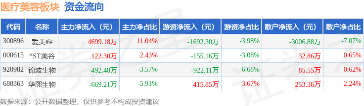 从资金流向上来看,当日医疗美容板块主力资金净流入4152.26万元,游资资金净流出1431.61万元,散户资金净流出2720.66万元。医疗美容板块个股资金流向见下表: