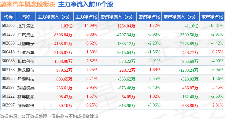 从资金流向上来看,当日蔚来汽车概念股板块主力资金净流出8.0亿元,游资资金净流入5151.65万元,散户资金净流入7.48亿元。蔚来汽车概念股板块个股资金流向见下表: