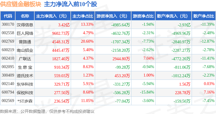 从资金流向上来看,当日供应链金融板块主力资金净流出6603.28万元,游资资金净流入607.08万元,散户资金净流入5996.21万元。供应链金融板块个股资金流向见下表: