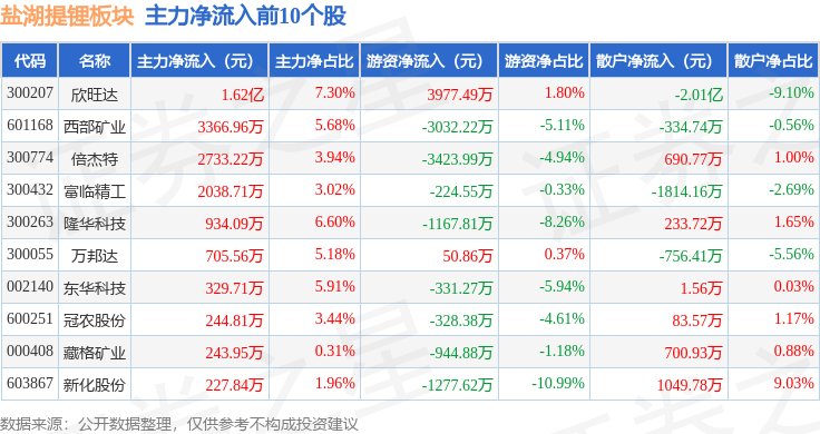 从资金流向上来看,当日盐湖提锂板块主力资金净流出11.01亿元,游资资金净流入1166.65万元,散户资金净流入10.89亿元。盐湖提锂板块个股资金流向见下表: