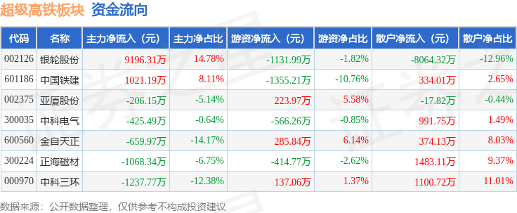 从资金流向上来看,当日超级高铁板块主力资金净流入6619.78万元,游资资金净流出2821.35万元,散户资金净流出3798.42万元。超级高铁板块个股资金流向见下表: