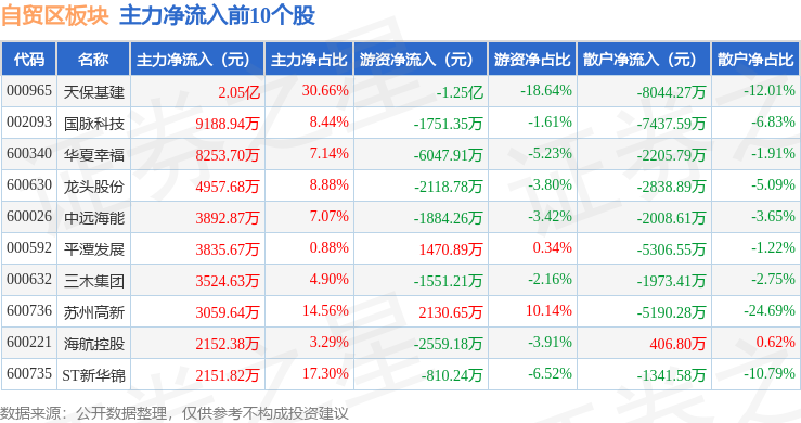 从资金流向上来看,当日自贸区板块主力资金净流出32.23亿元,游资资金净流出1537.15万元,散户资金净流入32.39亿元。自贸区板块个股资金流向见下表: