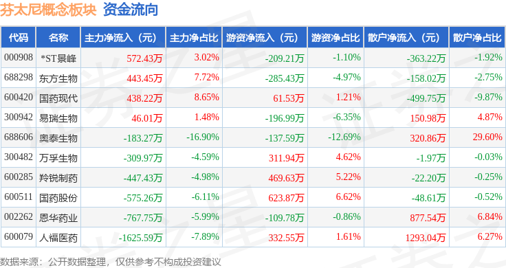 从资金流向上来看,当日芬太尼概念板块主力资金净流出2409.17万元,游资资金净流入860.52万元,散户资金净流入1548.65万元。芬太尼概念板块个股资金流向见下表: