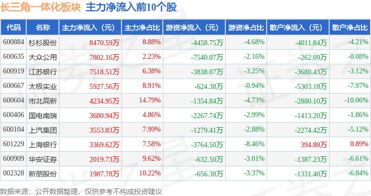 从资金流向上来看,当日长三角一体化板块主力资金净流出15.65亿元,游资资金净流出7232.94万元,散户资金净流入16.38亿元。长三角一体化板块个股资金流向见下表: