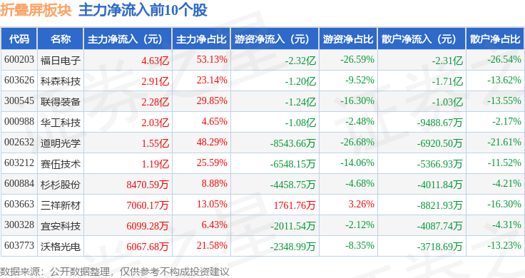 从资金流向上来看,当日折叠屏板块主力资金净流入7.02亿元,游资资金净流出7.24亿元,散户资金净流入2244.41万元。折叠屏板块个股资金流向见下表: