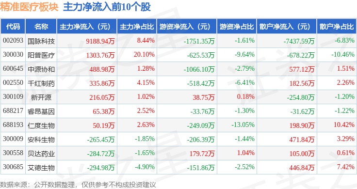从资金流向上来看,当日精准医疗板块主力资金净流出6.72亿元,游资资金净流入3.44亿元,散户资金净流入3.27亿元。精准医疗板块个股资金流向见下表: