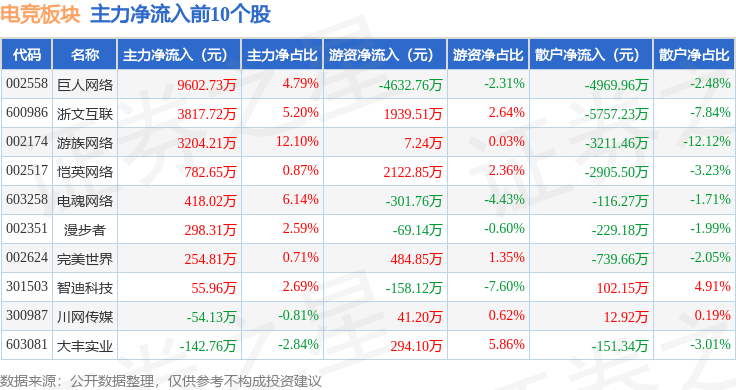 从资金流向上来看,当日电竞板块主力资金净流出1.76亿元,游资资金净流入7321.63万元,散户资金净流入1.03亿元。电竞板块个股资金流向见下表: