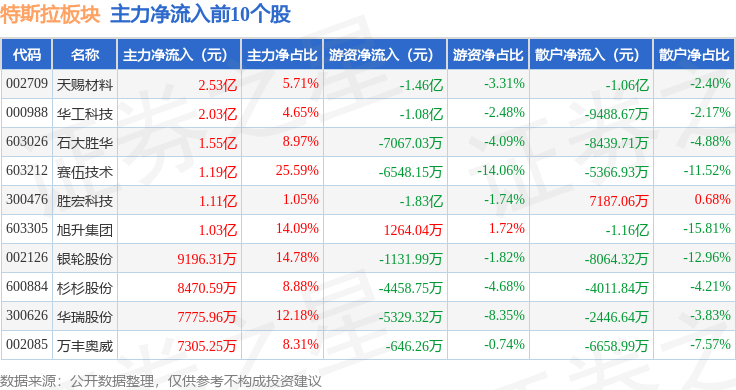 从资金流向上来看,当日特斯拉板块主力资金净流出13.53亿元,游资资金净流出2.11亿元,散户资金净流入15.65亿元。特斯拉板块个股资金流向见下表: