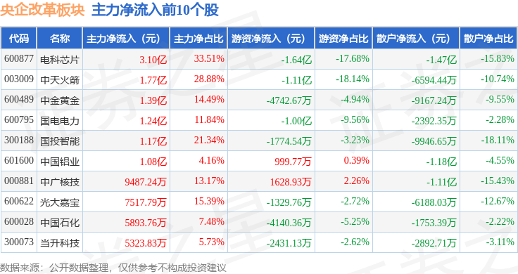 从资金流向上来看,当日央企改革板块主力资金净流出37.41亿元,游资资金净流入5.77亿元,散户资金净流入31.64亿元。央企改革板块个股资金流向见下表: