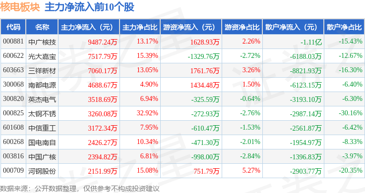 从资金流向上来看,当日核电板块主力资金净流出17.31亿元,游资资金净流入3.95亿元,散户资金净流入13.35亿元。核电板块个股资金流向见下表: