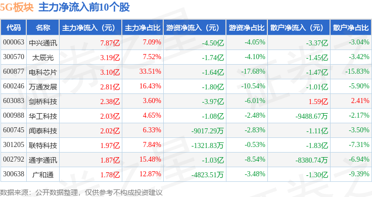 从资金流向上来看,当日5G板块主力资金净流出32.32亿元,游资资金净流出2.19亿元,散户资金净流入34.51亿元。5G板块个股资金流向见下表: