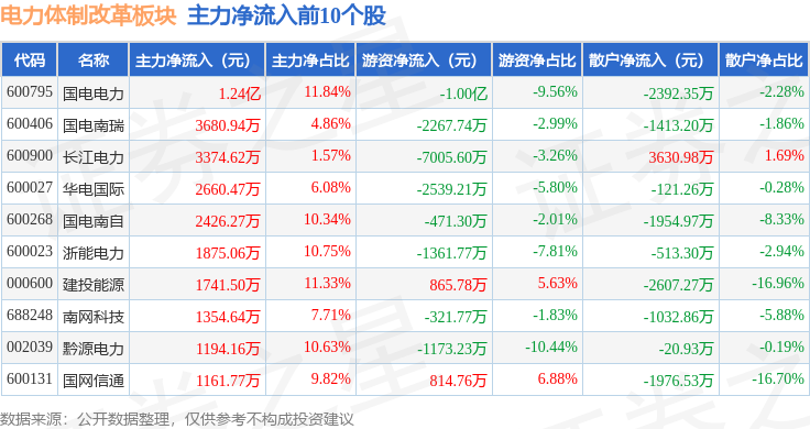 从资金流向上来看,当日电力体制改革板块主力资金净流出3.64亿元,游资资金净流出4430.44万元,散户资金净流入4.09亿元。电力体制改革板块个股资金流向见下表: