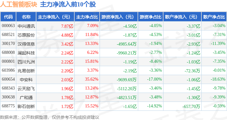 从资金流向上来看,当日人工智能板块主力资金净流出87.09亿元,游资资金净流出10.79亿元,散户资金净流入97.88亿元。人工智能板块个股资金流向见下表: