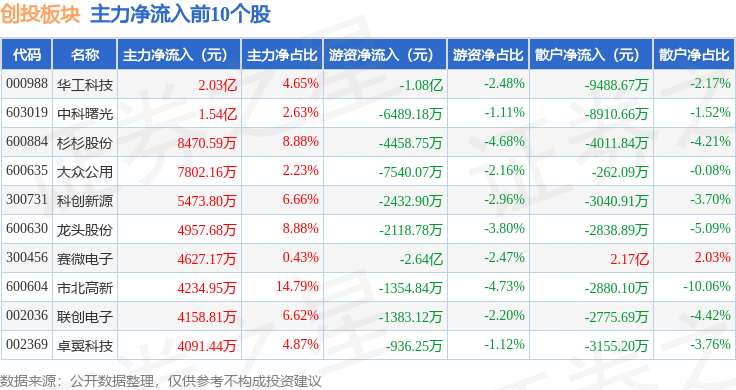 从资金流向上来看,当日创投板块主力资金净流出8.34亿元,游资资金净流出4.02亿元,散户资金净流入12.36亿元。创投板块个股资金流向见下表: