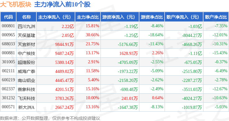 从资金流向上来看,当日大飞机板块主力资金净流出10.41亿元,游资资金净流入7068.71万元,散户资金净流入9.71亿元。大飞机板块个股资金流向见下表: