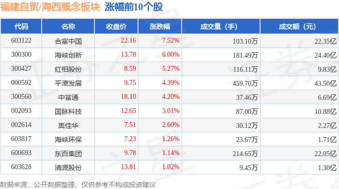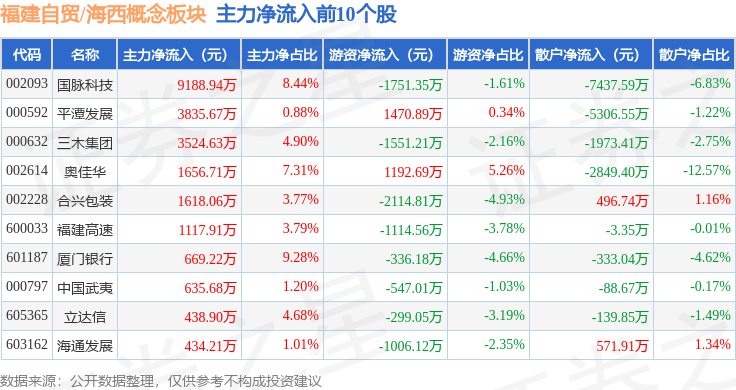 从资金流向上来看,当日福建自贸/海西概念板块主力资金净流出20.58亿元,游资资金净流出5657.33万元,散户资金净流入21.15亿元。福建自贸/海西概念板块个股资金流向见下表: