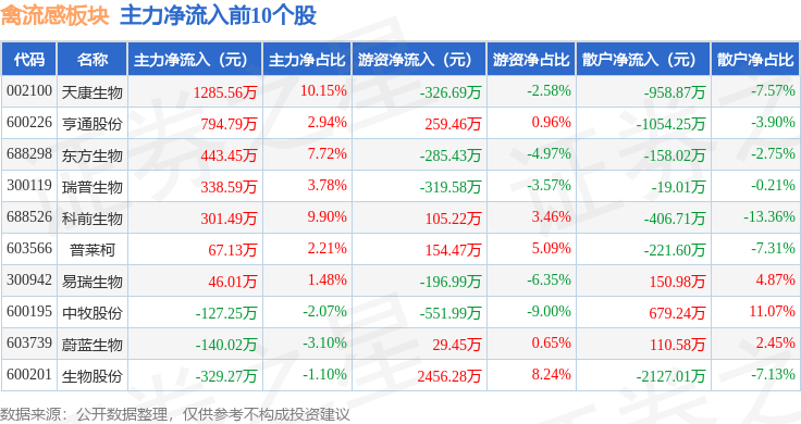 从资金流向上来看,当日禽流感板块主力资金净流入1153.67万元,游资资金净流入2482.23万元,散户资金净流出3635.9万元。禽流感板块个股资金流向见下表: