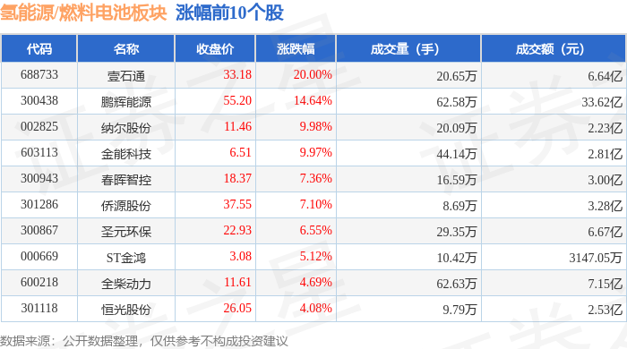 证券之星消息,11月27日氢能源/燃料电池板块较上一交易日下跌0.11%,中集集团领跌。当日上证指数报收于3875.26,上涨0.29%。深证成指报收于12875.19,下跌0.25%。氢能源/燃料电池板块个股涨跌见下表: