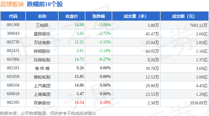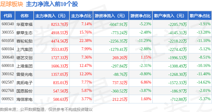从资金流向上来看,当日足球板块主力资金净流入1.53亿元,游资资金净流出5600.98万元,散户资金净流出9700.0万元。足球板块个股资金流向见下表: