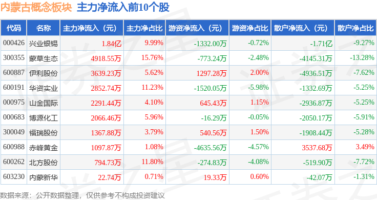从资金流向上来看,当日内蒙古概念板块主力资金净流入1.34亿元,游资资金净流入4783.61万元,散户资金净流出1.82亿元。内蒙古概念板块个股资金流向见下表: