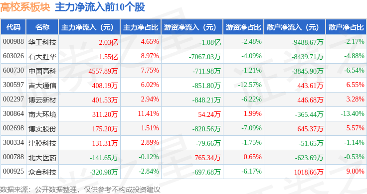 从资金流向上来看,当日高校系板块主力资金净流入1084.56万元,游资资金净流出1.5亿元,散户资金净流入1.39亿元。高校系板块个股资金流向见下表: