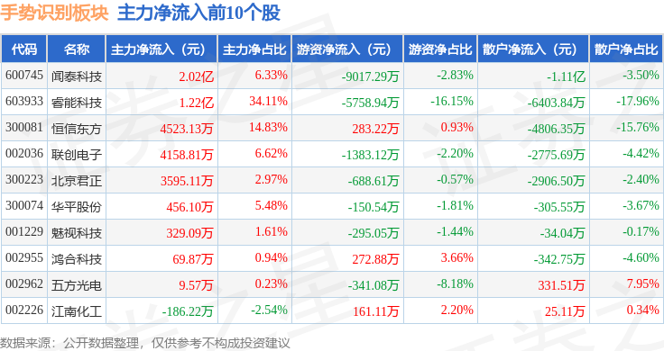 从资金流向上来看,当日手势识别板块主力资金净流入2.81亿元,游资资金净流出1.5亿元,散户资金净流出1.31亿元。手势识别板块个股资金流向见下表: