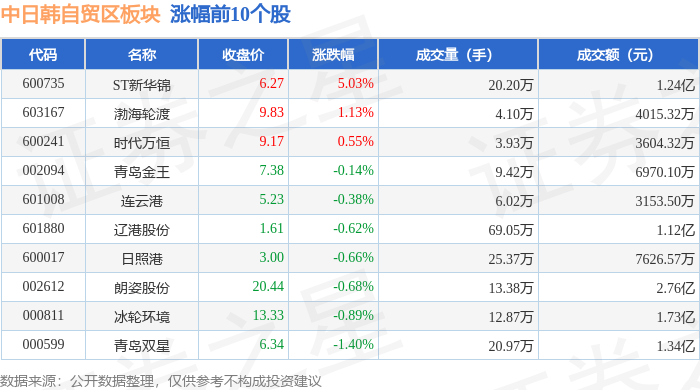 证券之星消息,11月27日中日韩自贸区板块较上一交易日下跌1.62%,中国中免领跌。当日上证指数报收于3875.26,上涨0.29%。深证成指报收于12875.19,下跌0.25%。中日韩自贸区板块个股涨跌见下表: