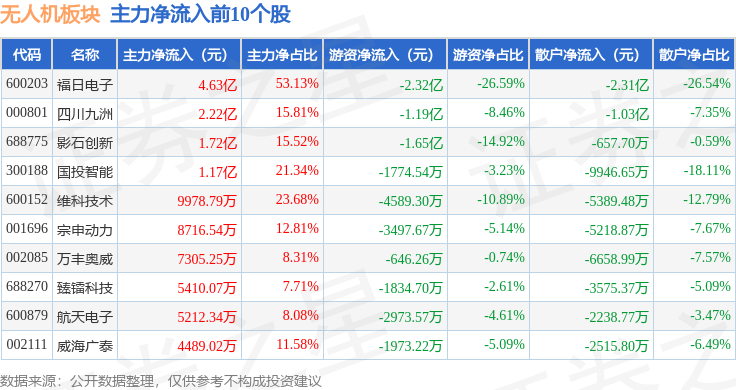 从资金流向上来看,当日无人机板块主力资金净流入5704.34万元,游资资金净流出9.35亿元,散户资金净流入8.78亿元。无人机板块个股资金流向见下表: