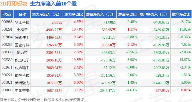 从资金流向上来看,当日3D打印板块主力资金净流入2.59亿元,游资资金净流入863.77万元,散户资金净流出2.68亿元。3D打印板块个股资金流向见下表: