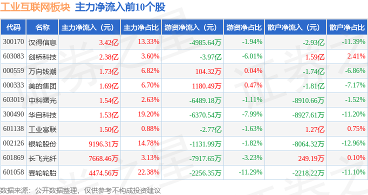 从资金流向上来看,当日工业互联网板块主力资金净流出21.41亿元,游资资金净流出4.69亿元,散户资金净流入26.1亿元。工业互联网板块个股资金流向见下表: