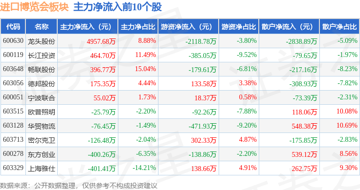 从资金流向上来看,当日进口博览会板块主力资金净流出3193.89万元,游资资金净流入244.89万元,散户资金净流入2948.99万元。进口博览会板块个股资金流向见下表: