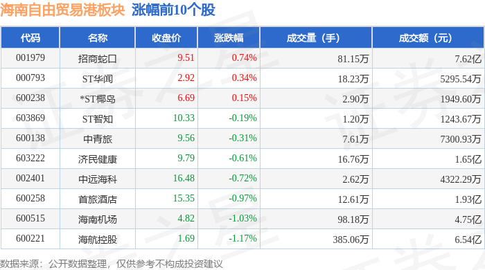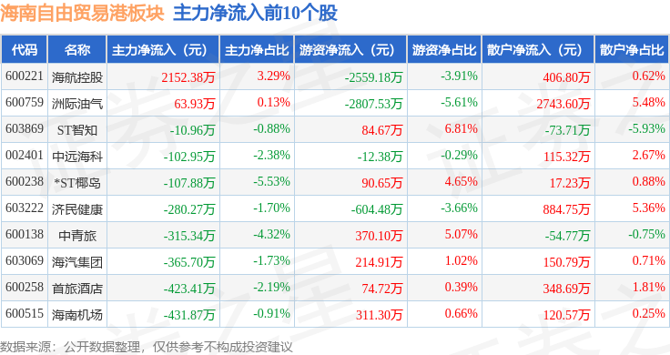 从资金流向上来看,当日海南自由贸易港板块主力资金净流出11.23亿元,游资资金净流入1.64亿元,散户资金净流入9.59亿元。海南自由贸易港板块个股资金流向见下表: