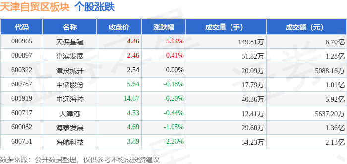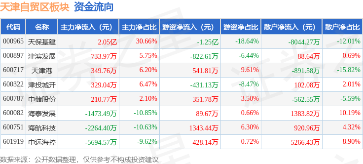 从资金流向上来看,当日天津自贸区板块主力资金净流入1.27亿元,游资资金净流出1.1亿元,散户资金净流出1736.47万元。天津自贸区板块个股资金流向见下表: