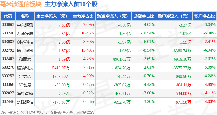 从资金流向上来看,当日毫米波通信板块主力资金净流入9.59亿元,游资资金净流出12.54亿元,散户资金净流入2.94亿元。毫米波通信板块个股资金流向见下表: