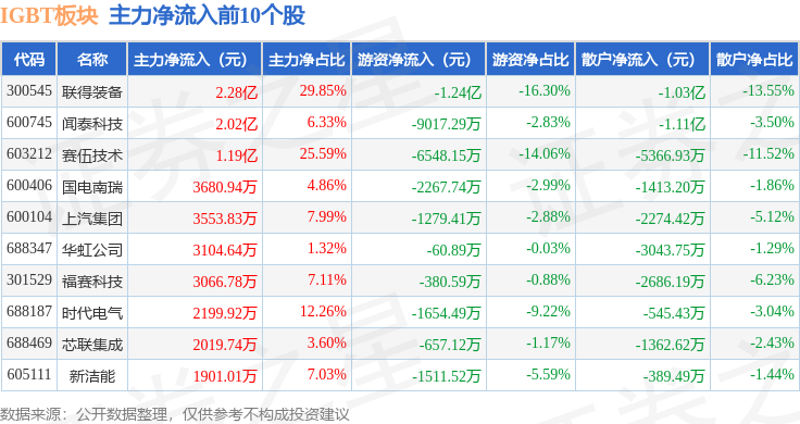从资金流向上来看,当日IGBT板块主力资金净流入2099.16万元,游资资金净流出1.93亿元,散户资金净流入1.72亿元。IGBT板块个股资金流向见下表: