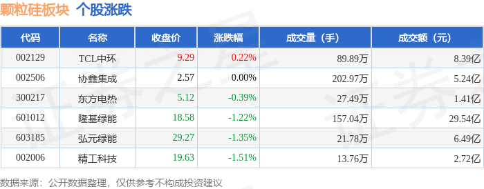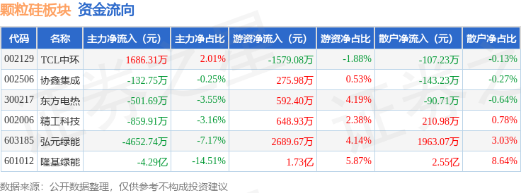 从资金流向上来看,当日颗粒硅板块主力资金净流出4.73亿元,游资资金净流入2.0亿元,散户资金净流入2.74亿元。颗粒硅板块个股资金流向见下表: