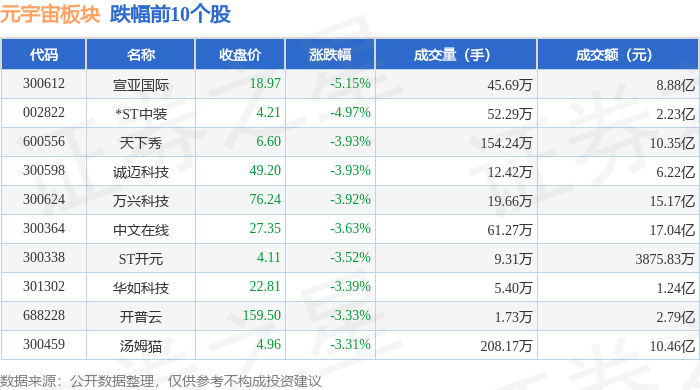 证券之星消息,11月27日元宇宙板块较上一交易日下跌1.24%,宣亚国际领跌。当日上证指数报收于3875.26,上涨0.29%。深证成指报收于12875.19,下跌0.25%。元宇宙板块个股涨跌见下表: