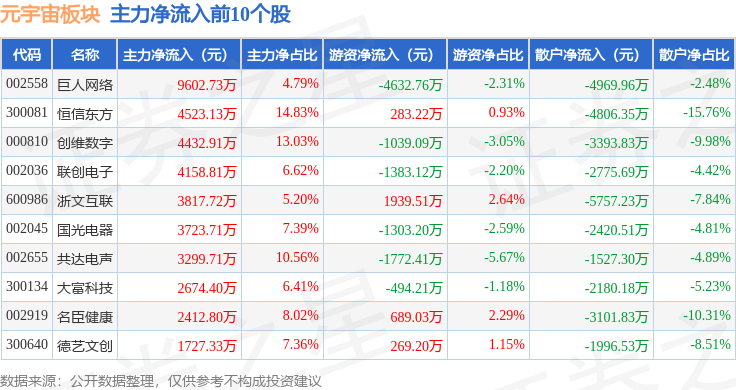 从资金流向上来看,当日元宇宙板块主力资金净流出38.41亿元,游资资金净流入5.31亿元,散户资金净流入33.11亿元。元宇宙板块个股资金流向见下表: